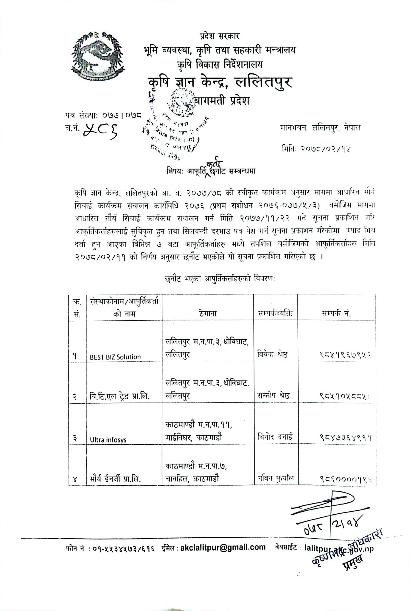 छनौट भएका आपुर्तिकर्ताहरुको विवरण 2078-02-14 Closed !!!