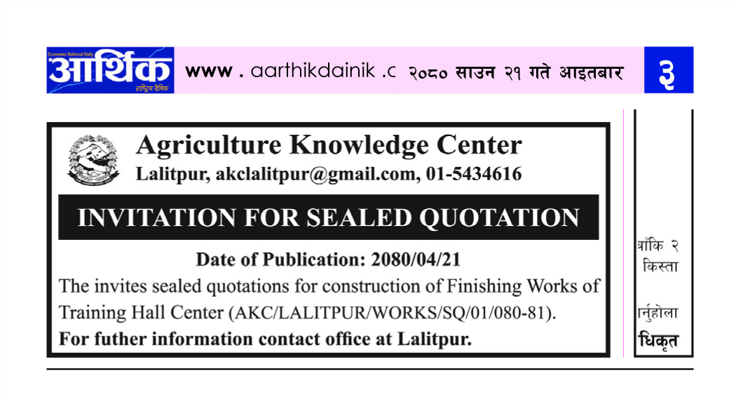 कार्यालयको तालिमहल निर्माण तथा फर्निसिङ्ग गर्ने बोलपत्र आव्हानको सूचना 2080-04-21 Closed !!!