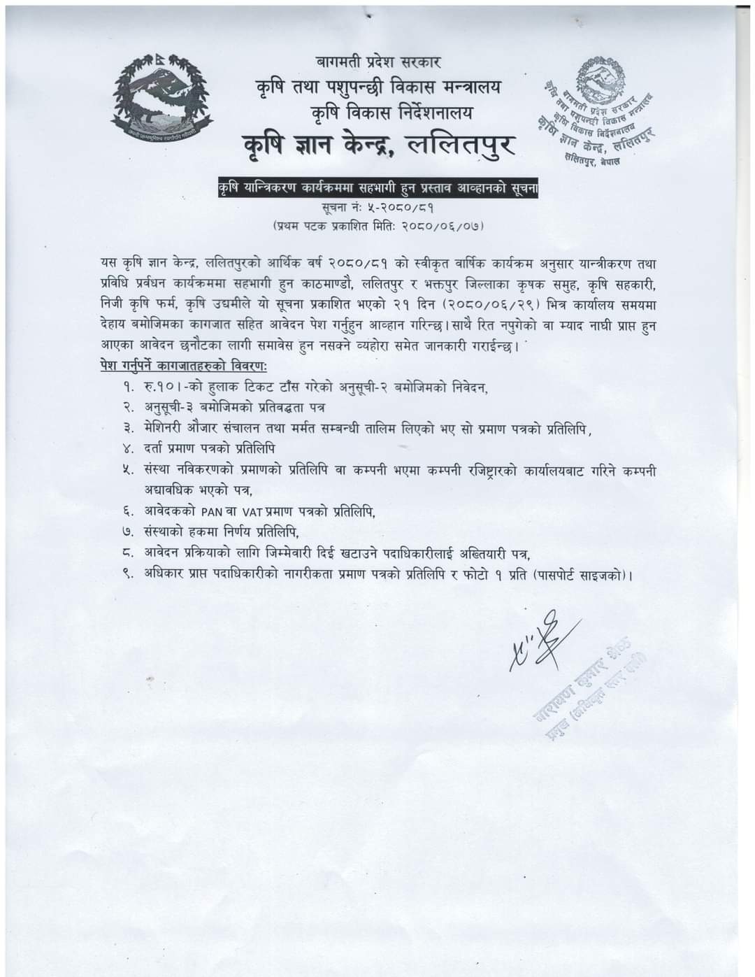 कृषि यान्त्रिकरण कार्यक्रमको लागि प्रस्ताव आह्वानको सूचना 2080-06-07 Closed !!!
