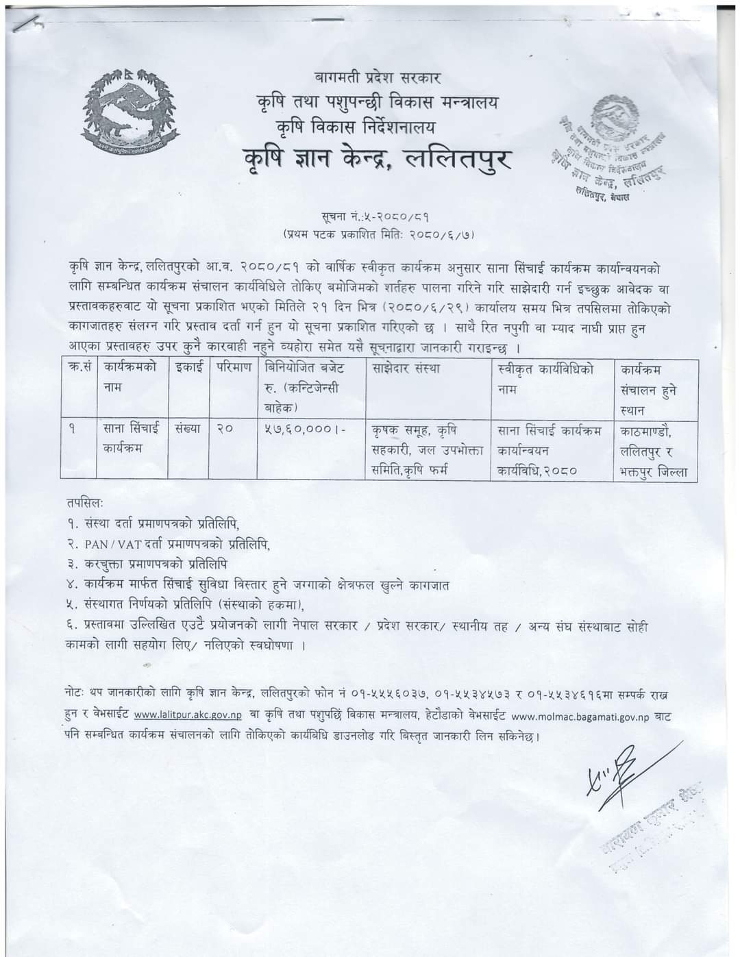 साना सिचाइ कार्यक्रमको लागि प्रस्ताव आह्वानको सूचना 2080-06-07 Closed !!!