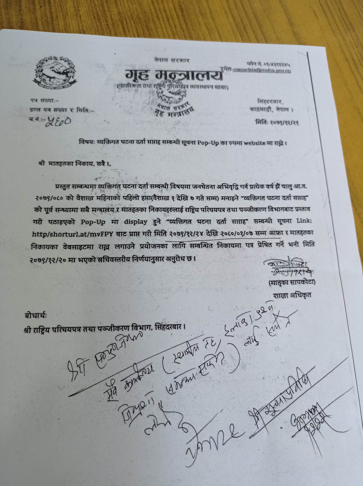 जिल्ला प्रशासन कार्यालय मार्फत प्राप्त ब्यक्तिगत घटना दर्ता गर्न सम्बन्धी सूचना 2079-12-24 Closed !!!